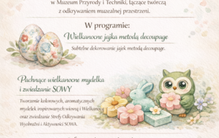 Serdecznie zapraszamy uczniów szkół podstawowych, ponadpodstawowych oraz przedszkolaków do udziału w warsztatach wielkanocnych organizowanych przez Muzeum Przyrody i Techniki. Zajęcia mają charakter edukacyjno-artystyczny i sprzyjają rozwijaniu kreatywności oraz umiejętności manualnych dzieci. W ramach zajęć proponujemy tematy: - Warsztaty dekorowania [...]